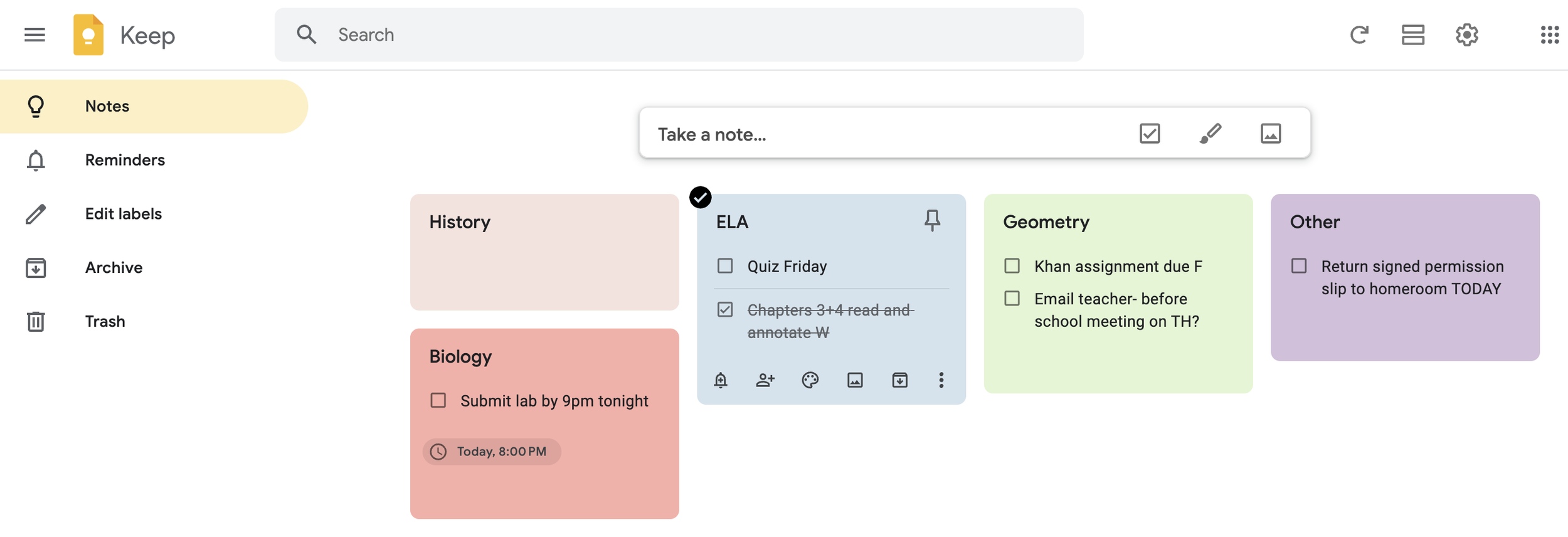 If your student is interested in adopting an electronic system to keep track of short term tasks and to-dos, Google Keep is a great option. Keep, is a free app included in the Google suite, requires minimal set-up and is easy accessible from a phone or laptop. Students describe Keep as a simple and approachable way to keep track of what they need to do for their classes.